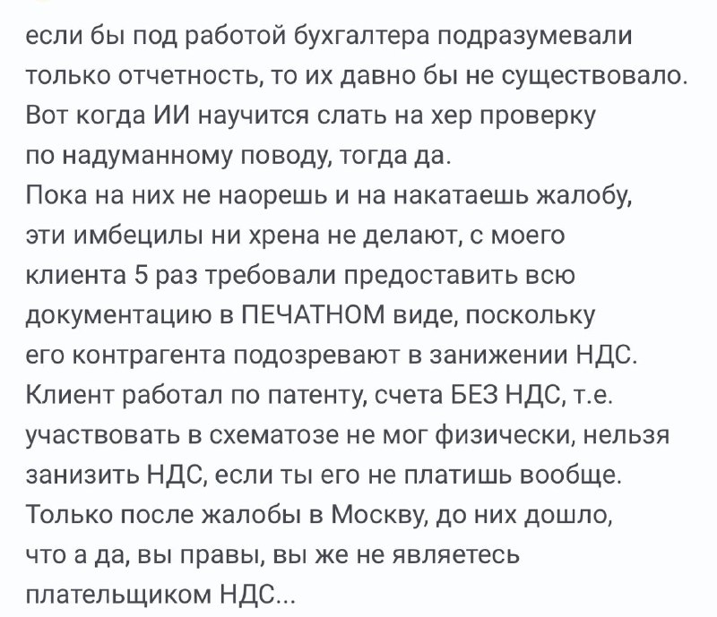 Русский ИТ бизнес08.04.2026 18:38Когда читаешь, что ИИ заменит много профессий в том числе и бухгалтера :) Ага ага, верим. @bezsmuzi