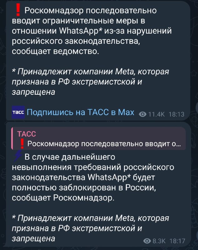 Марзаганов вещает28.11.2025 15:23РКН начал ограничивать WhatsApp, пишет ТАСС. Если мессенджер не выполнит требования законодательства РФ, его полностью заблокируют.Докатились, получается