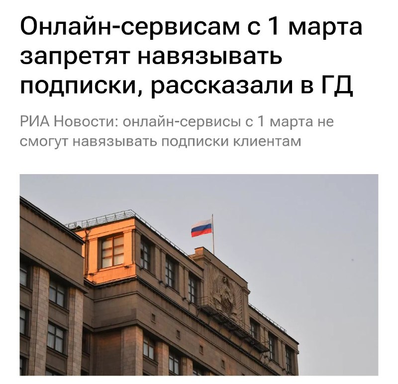 Марзаганов вещает13.01.2026 07:31В России запретят автосписания за онлайн-подписки. С 1 марта сервисам нельзя будет снимать деньги без явного согласия пользователя.Мы ждали. Мы дождались