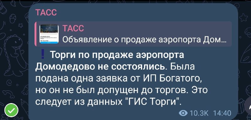 Марзаганов вещает20.01.2026 11:48Домодедово не продали на аукционе, потому что заявка была только одна, да и ту не допустили.Забавно, что её подал ИП Богатый
