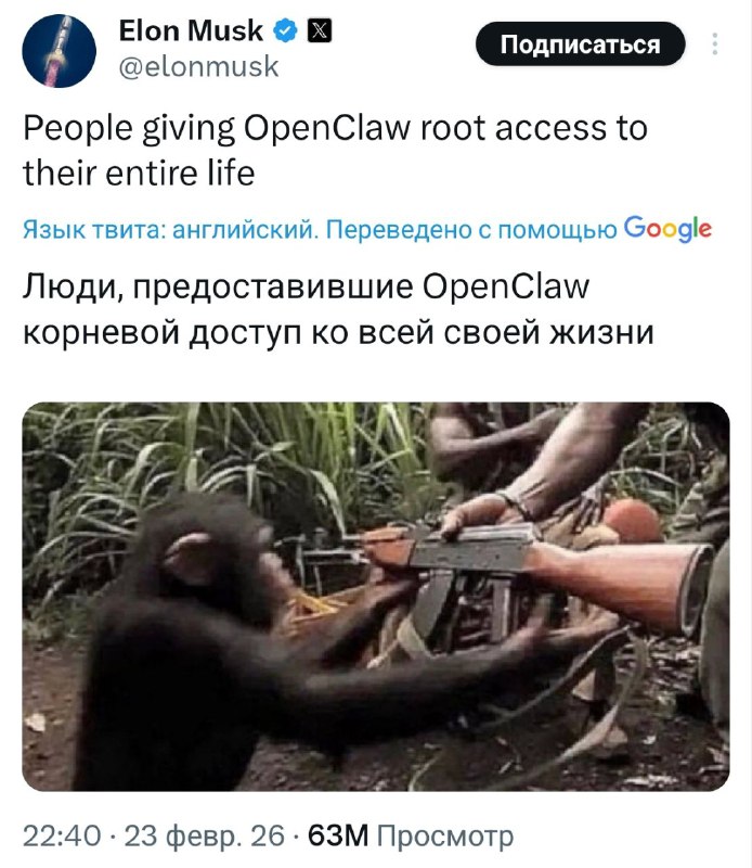 Марзаганов вещает26.02.2026 06:56Маск высказал всё, что он думает про OpenClaw.И в чём он собственно не прав