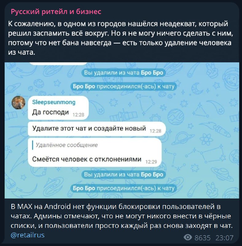 PRO Hi-Tech08.04.2026 08:01Пишут, что в Max нельзя забаннить спамеров в чатах. Кто уже проверял, это правда?