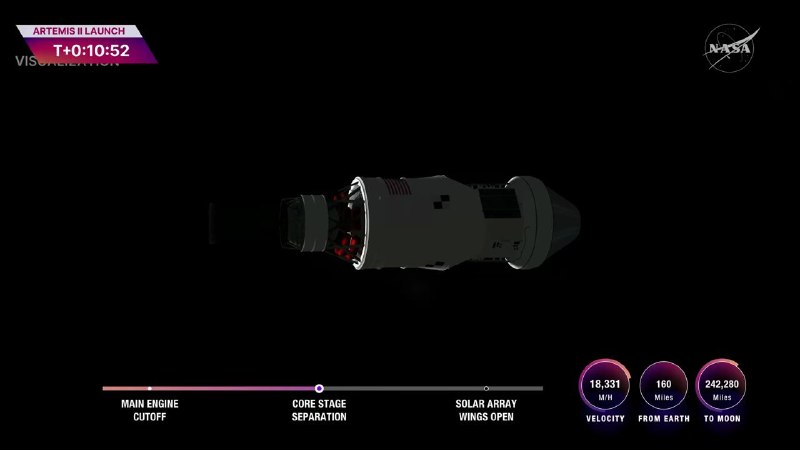 Техасский Вестник01.04.2026 22:46Первая часть запуска Artemis 2 официально прошла успешно и без нареканий. Через 9 минут раскроют панели, и после этого будет импульс с помощью ICPS.